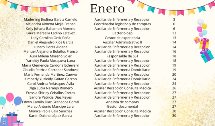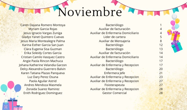 ✨ Este mes queremos felicitar con mucho cariño a nuestros compañeros que están de cumpleaños. Es una oportunidad para celebrar su vida, reconocer lo valiosos que son dentro de nuestro grupo y desearles que este nuevo año les traiga salud, éxito y mucha felicidad. ¡Que cada uno de sus sueños se haga realidad y disfruten al máximo su día especial!