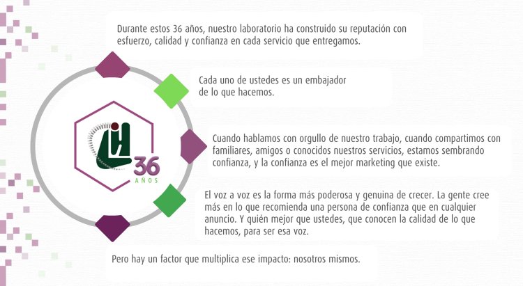 Queremos reconocer y agradecer el esfuerzo de quienes hacen posible que sigamos creciendo. Cada cliente que llegue por su recomendación será un logro compartido, porque juntos somos más que un laboratorio: somos un equipo que transforma la salud y aporta al bienestar de muchas personas. Cuando impulsamos nuestra misión desde adentro, el impacto se multiplica. ¡Gracias por ser la voz que refleja lo que somos y lo que representamos!